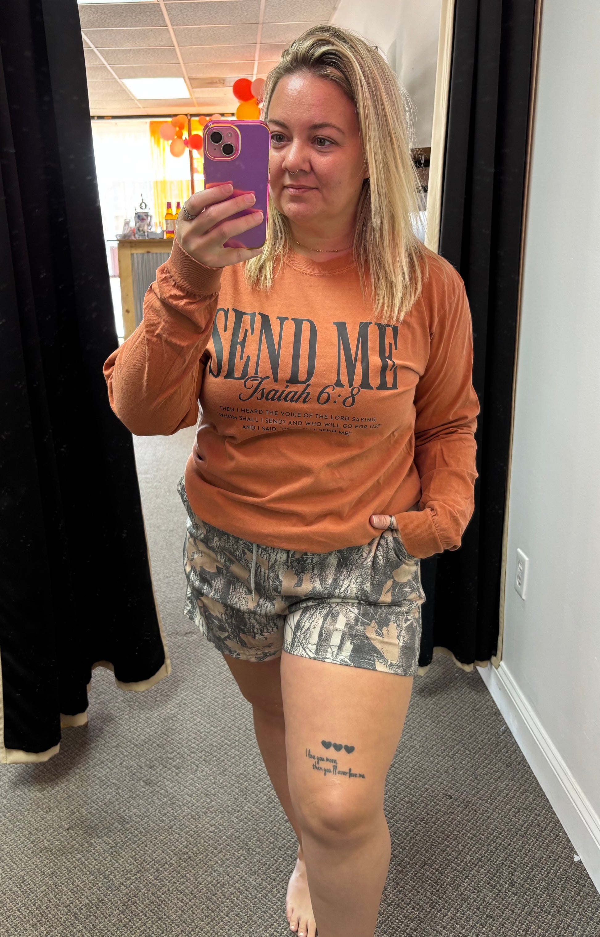 Celebrate your bold spirit with our "Send Me" long sleeve tee, featuring Isaiah 6:8 printed proudly on soft Comfort Colors fabric. Perfectly paired with our fresh camo shorts, this combo brings a fun, adventurous vibe to your casual wardrobe. Ready to go wherever life sends you!
