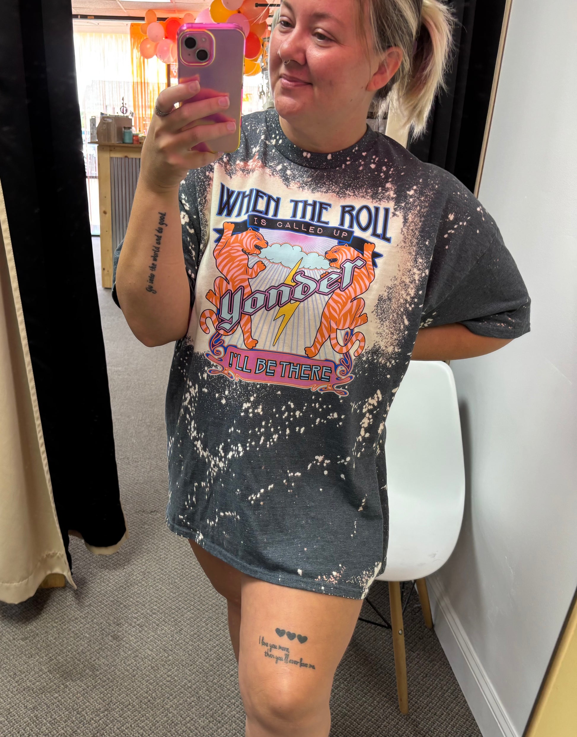 Celebrate timeless spirit with this playful hand-bleached tee featuring the classic hymn "When the Roll is Called" sublimated in vibrant detail. Perfect for everyday wear, it adds a splash of vintage charm to your casual style while keeping comfort front and center.